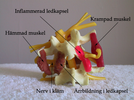 Alla nerver som kommer från ryggmärgen passerar trånga passager mellan kotkropp, disk och ryggkotornas leder. Om nerverna blir klämda av felställningar eller förträngningar får vi inflammation i nerven som t ex vid ischiasverk i benet. Vid akut nervpåverkan kan vi testa detta ganska väl och symtomen är ofta tydliga. Betydligt svårare är det om en nerv gradvis under lång tid utsätts för ett tryck. Det kan då ske en långsam förtvining av nerven med dåliga impulser till det som nerven ska styra. Detta upptäcks ofta inte förrän det gått långt.